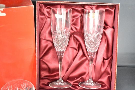 A selection of 20th-century crystalware, to include a pair of Royal Albert crystal wine glasses, a Royal Brierley whiskey set comprising 4 glasses and a decanter, and a pair of Doulton International Crystal cut champagne flutes, all with original boxes, some having stickers, (9 pieces in total), condition is consistent with age and use.