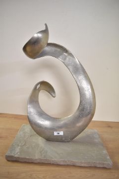 An unusual contemporary metal sculpture, of a free abstract form and having a heavy stone base, unmarked, 48cm in height, condition is consistent with age and use.
