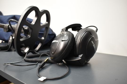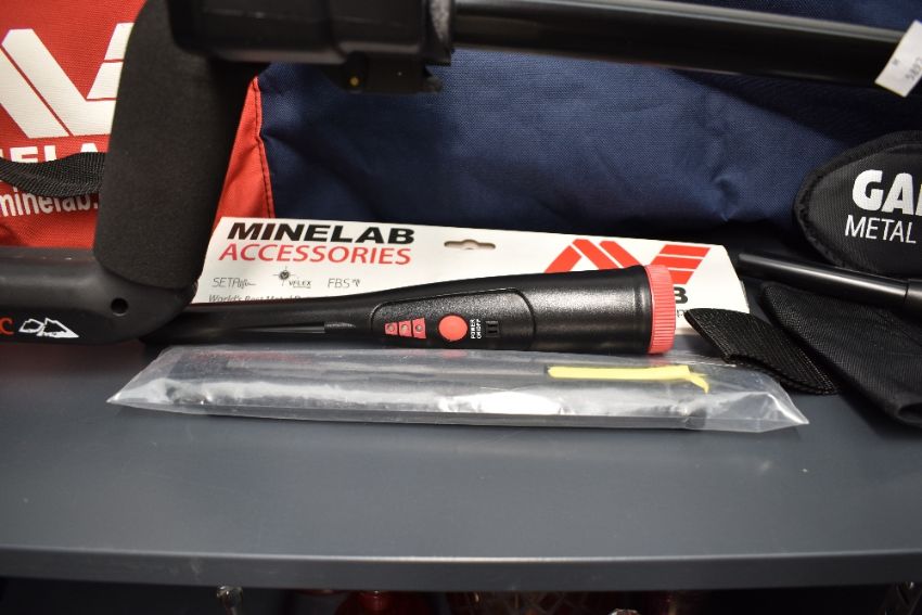 A Minelab E-Trac metal detector, a high-end multi-frequency (1.5–100 kHz) detector, renowned for exceptional silver coin recovery and deep target detection in challenging, mineralised, or saltwater conditions, featuring advanced Smartfind discrimination, a clear LCD screen, and USB connectivity for custom, user-shareable settings; accompanied by a selection of Minelab accessories, including a slim rechargeable battery, digging tool, headphones, carry case, and a selection of vintage Ordnance Survey maps, (1 metal detector with accessories), condition consistent with age and use, appearing to be lightly used.