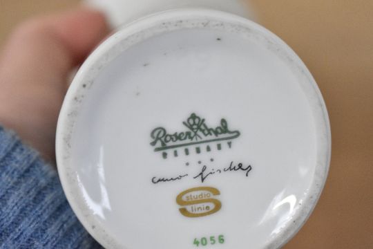 A quantity of 20th-century German Rosenthal porcelain vases, including a Cuno Fischer studio linie example featuring colourful decorative abstract motifs to the base, a Bjorn Wiinblad studio linie example with a relief pattern of stylised peacocks, and two Japanese Quince decorative vases, all marked to base, (4), no obvious damages, slight surface wear to Wiinblad vase and small chip to gilded rim of larger Quince vase.