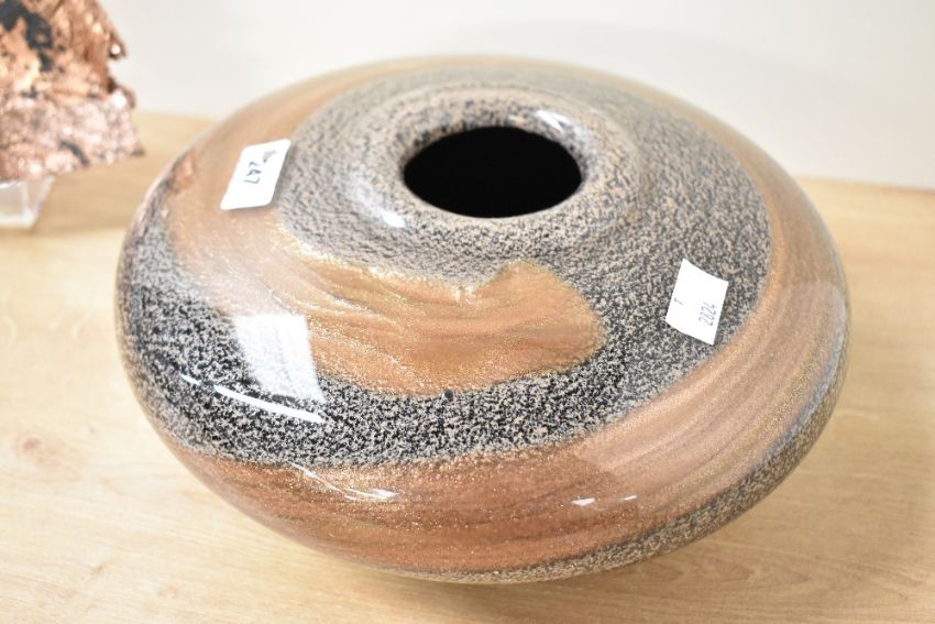 A large contemporary art glass decorative bowl, of flattened dish-like form with a small central opening, featuring a swirling pattern of metallic bronze, black, and brown with a glittered textured finish; sold with a decorative textured metal form, both unmarked, (2), no visible damages.