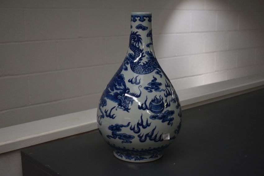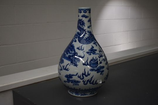 A large Chinese blue and white pottery tianqiuping-style vase, decorated with one large coiled dragon chasing a pearl, with Quinlong-style mark to base, 40cm height, condition consistent with age and use, small areas of surface ware and hairline crack to base.
