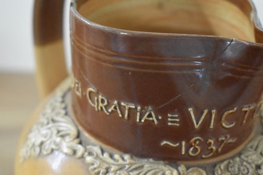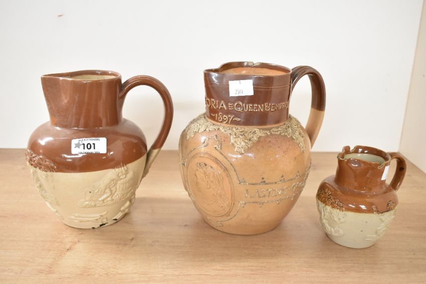 A Victorian Doulton Lambeth stoneware jug commemorating Queen Victoria's Diamond Jubilee in 1897, featuring applied relief portraits and a motto 'She brought her people lasting good'; sold with two presumed Bourne Denby hunting jugs, marked to base, (3), condition is consistent with age and use, visible chips to rim of smallest example and Queen Victoria example, fixed chip to spout of Bourne Denby and an area of presumed black paint to base of jug, overall areas of surface wear to all examples.