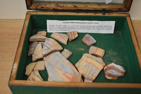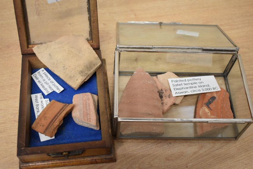 A selection of documented and displayed ancient Egyptian pottery fragments, New Kingdom period, Upper Egypt, to include material from a pit near Deir el-Medina, the workmen’s village on the West Bank of Luxor, approximately 3,000 to 3,500 years old; painted pottery from the Satet Temple on Elephantine Island, Aswan, circa 3,000 BC; and pottery from Malkata Palace, West Bank, Luxor, all by repute, (approximately 24 pottery fragments, presented in 3 display cases of varying sizes), condition consistent with age and use.