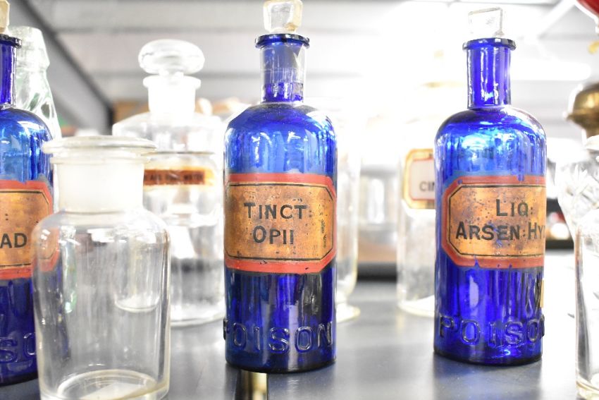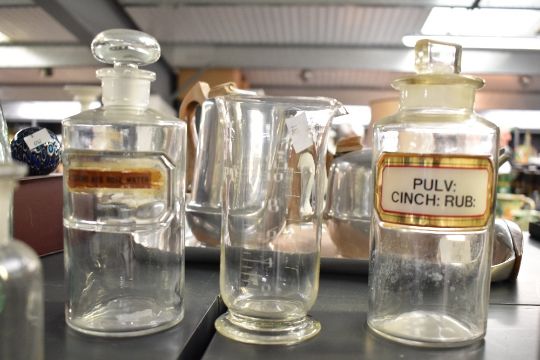 A selection of 19th- to early 20th-century apothecary glass bottles, to feature three cobalt blue glass poison bottles, one still retaining original chemist’s sticker to base ‘J.T. Bayliff, Chemist, Kirkby Lonsdale’, all with original stoppers; a small cobalt blue Milk of Magnesia bottle; a large glass apothecary bottle with stopper featuring a gilded-edge under-glass label; a small green glass hexagonal poison bottle; a Curwen Brothers of Lancaster Codd-neck bottle and more, some marked but not all (approximately 15), condition consistent with age and use, sold as seen.