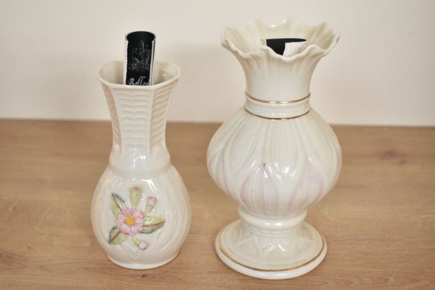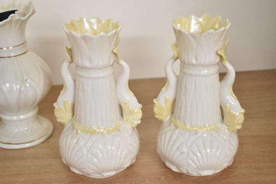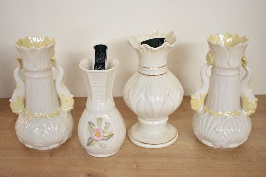 A quantity of 20th-century Irish Belleek Fine China, to include a small Lotus Blossom Spill vase; a pair of fish-handled spill vases and a small bud vase with floral decoration, all marked to base, (4), condition is consistent with age and use, chip to rim of one of the fish-handled spill vases.