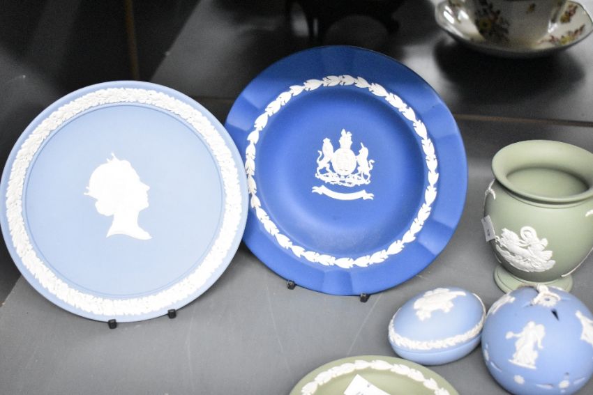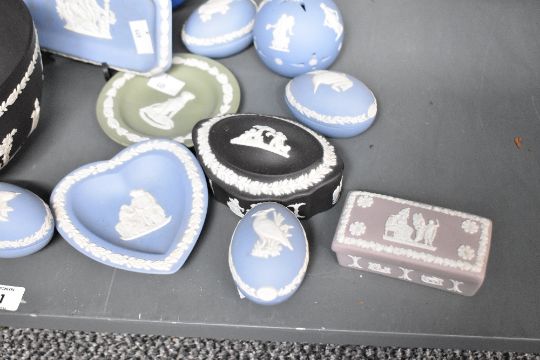 A collection of 15 late 20th century Wedgewood jasperware, featuring five 1980s The Wedgwood Easter Eggs on pale blue jasper, the black jasper neoclassical-styled Sacrificia bowl and a selection of plates, jewellery boxes and a vase (15).