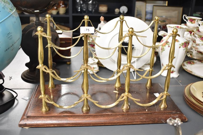 An early 20th-century French-style brass and mahogany nine-bottle wine rack, featuring elegant stanchions mounted to a dark wood base upon four additional feet-pads, unmarked, 48cm x 24cm and 28cm in height, condition is consistent with age and use, visible areas of brass metal ware and overall areas of surface dust consistent with storage.