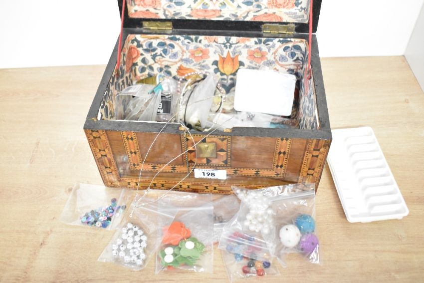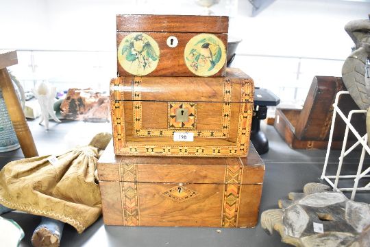 Two late 19th to early 20th-century walnut Tunbridge ware boxes, featuring intricate geometric marquetry inlay, with the smaller example having a domed hinged lid, brass escutcheon and plate detailing to the top; sold with a small wooden box with transferware bird decorations and a circular mother-of-pearl inlaid escutcheon, each having later additional floral paper-lined interiors and all teeming with an array of vintage buttons, (3 boxes and countless buttons), condition consistent with age and use, no keys, with some visible signs of wear to inlaid marquetry detailing and scuffs and scratches to the external wood.