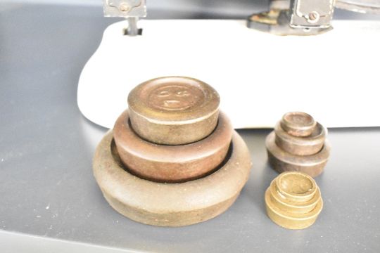A 20th-century William and Thomas Avery Limited of Birmingham iron and brass weighing scale with nine brass incremented weights, marked to scale, 32cm, condition is consistent with age and use.