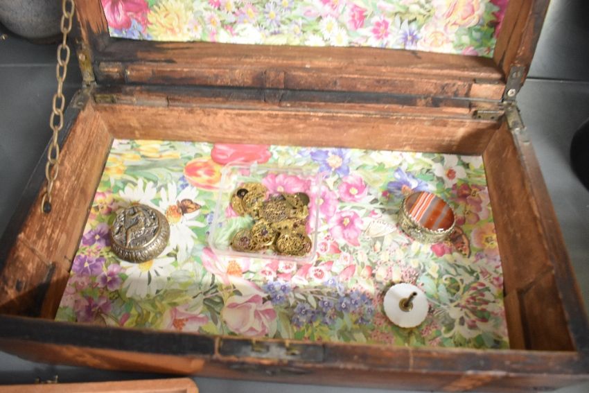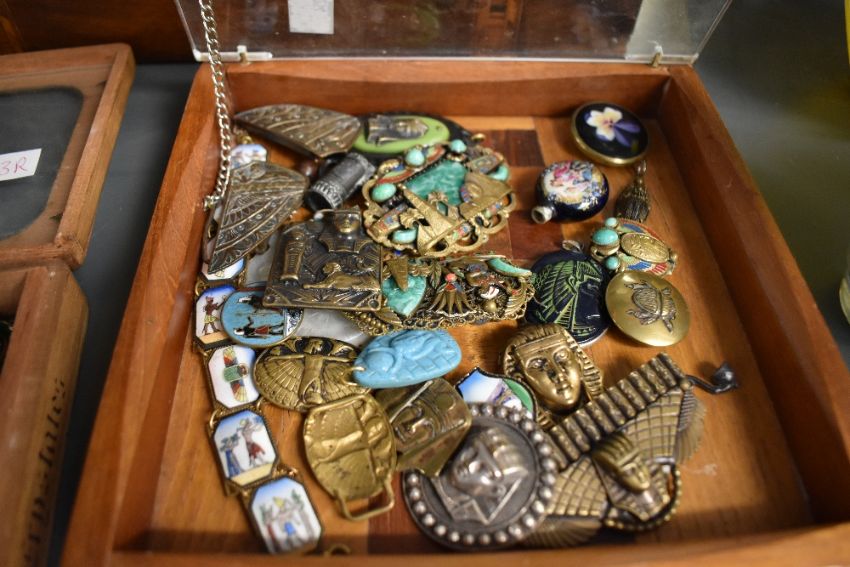 A wooden chest having a central oval plaque and inlay decoration, containing an assortment of costume jewellery, including belt buckles, scarab motif bracelets, pendants and statement pieces