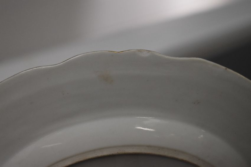A Victorian Royal Doulton-style ceramic plate, featuring a blue floral pattern, with a scalloped rope-motif edge and gilded rim detailing, unmarked, 24cm, condition is consistent with age and use, small chip to rim and gilded wear.