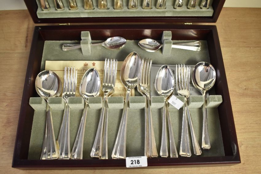 A 20th-century Arthur Prince of England silver-plated cutlery canteen, to include forks, knives, spoons of varying sizes, held within a dark hard wood canteen, marked to cutlery and canteen, (approximately 44 pieces), condition is consistent with age and use, accompanied by original leaflets of authenticity and care guide.