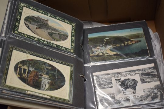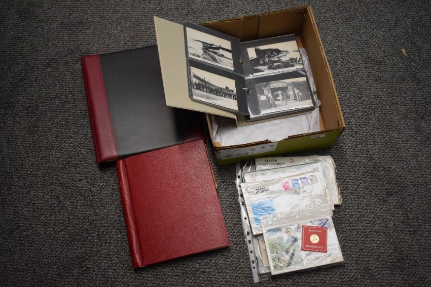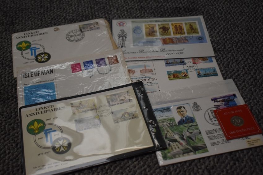 Isle of Man interest* A post card album, stamp album and first day covers (various and incomplete) together with an Isle of Man History of World War One first day cover collection (incomplete) and two coins
