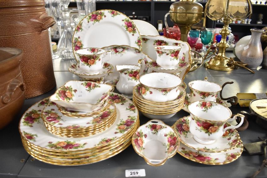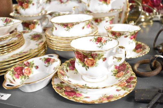 A quantity of 20th-century Royal Albert 'Old Country Rose' bone china tea and dinner service, featuring a delicate rose pattern with gilded detailing, to include cups; saucers; jug, side plates, dinner plates, sugar bowl and more; sold with a Royal Albert 'Celebration' oval-shaped platter, all marked to base with both 1962 -1974 and 1974 - 1980 makers marks, (approximately 37 pieces), condition is consistent with age and use, no visible chips or cracks, some areas gild wear.