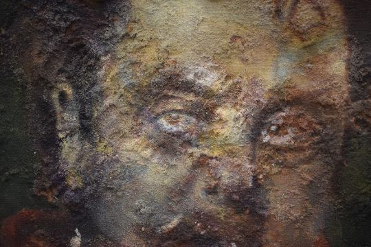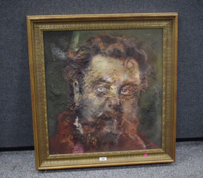 After Ilya Efimovich Repin (Ukrainian-Russian 1844 - 1930) Mixed media 'Modest Mussorgsky' a reproduction of the 1881 portrait of the Russian composer, a composite has been layered to the surface of the painting to create vast texture, unsigned or attributed, within moulded gilt frame, 59cm x 63cm & 74.5cm x 78cm overall. *The original portrait was painted whilst Mussorgsky was gravely ill in hospital, it is noted for capturing his humanity and psychological state in the days leading to his death. Repin refused payment for the portrait and it was donated as a memorial to the composer.