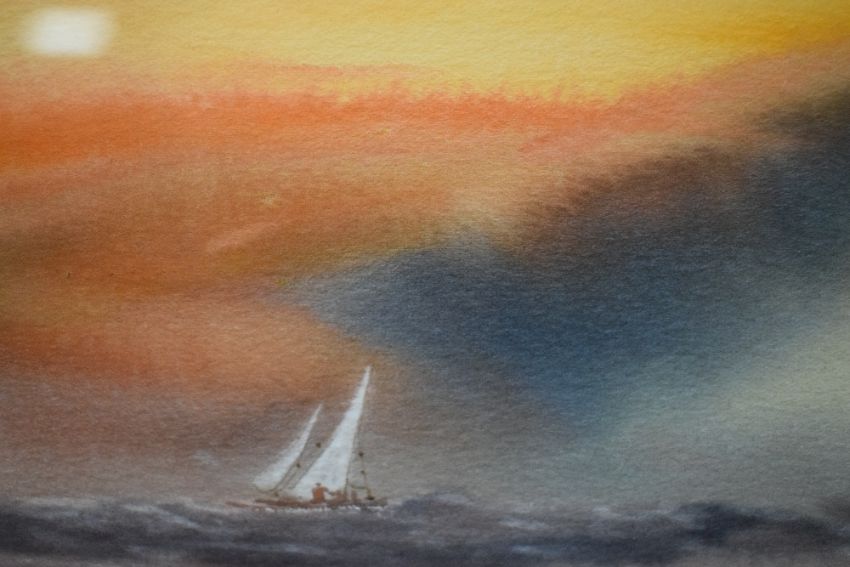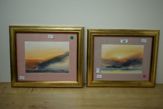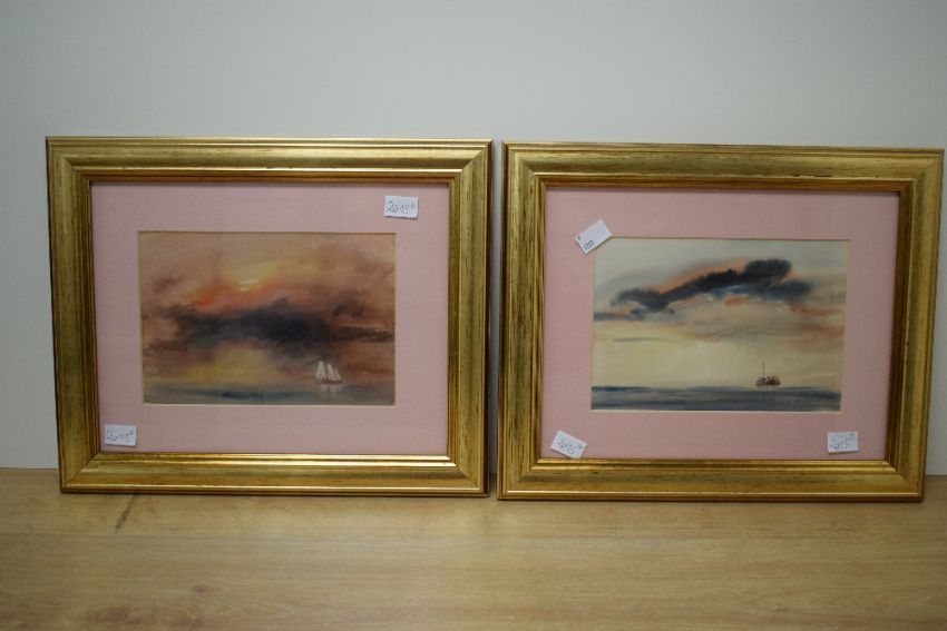 Trevor Castle (British 20th Century) A collection of four watercolours, seascapes with vibrant sunsets over sailing boats, initialled lower left and right, attributed verso, within pink card mounts and moulded gilt frames under glass 16.5cm x 22cm & 31.5cm x 37.5cm overall.