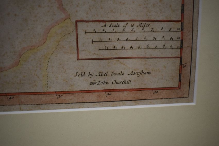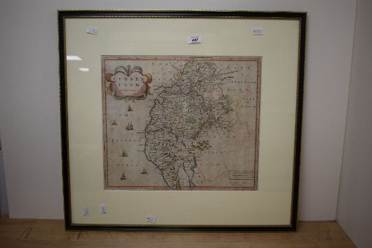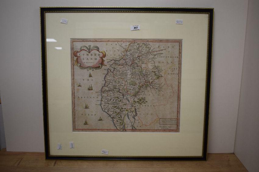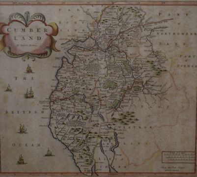 *Local Interest* After Robert Morden (British 1650 - 1703) Colourised map of the historic county of Cumberland, lower left reads 'Sold by Abel Swale Awnfham and John Churchill', verso states '...For Camdens Britannia Circa 1695 or Later', within card mount and moulded frame, under glass 43cm x 36cm & 66cm x 61cm overall.