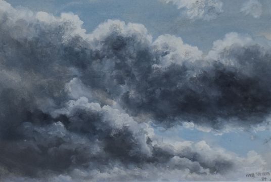 Meg Stevens (British 1931 - 2012) Gouache on paper, a tumultuous sky, signed and dated (1984) in pencil lower right, within stepped card mount and moulded frame, under glass 20.5cm x 14cm & 33cm x 27.5cm overall.