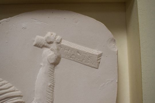 Eduardo Luigi Paolozzi (Scottish 1924 - 2005) Plaster relief , ceramic tile depicting a classical figure fighting a skeleton with baton that reads 'Hunts Remedy', artist biography verso, within stepped white frame, 22.5cm x 33cm & 43cm x 54cm overall. *Attributed by vendor.