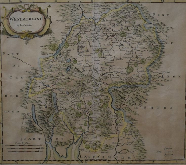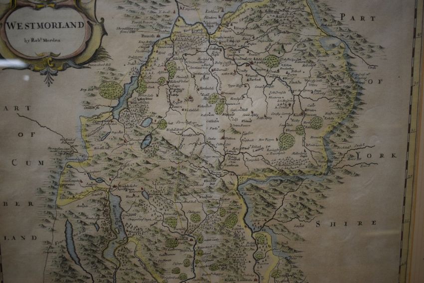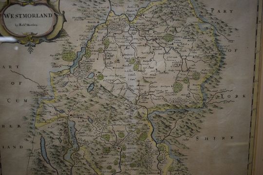 *Local Interest* After Robert Morden (British 1650 - 1703) Colourised map of the historic county of Westmorland, lower right reads 'Sold by Abel Swale Awnfham and John Churchill', verso states '...For Camdens Britannia Circa 1695 or Later', within card mount and moulded frame, under glass 42cm x 36cm & 60cm x 55.5cm overall.