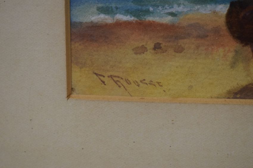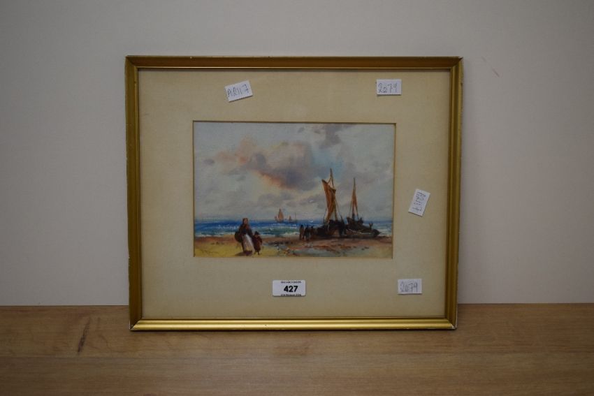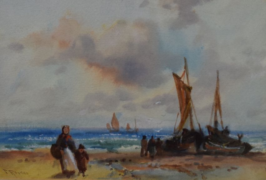 Frank Rousse (British 1894-1917) Watercolour 'Day's Catch', depicting a mother and child on the beach near fishing boats, signed lower left, within card mount and moulded gilt frame, under glass 21cm x 15cm & 35.5cm x 29.5cm overall. *Vendor believes location of painting is possibly Whitby Sands.