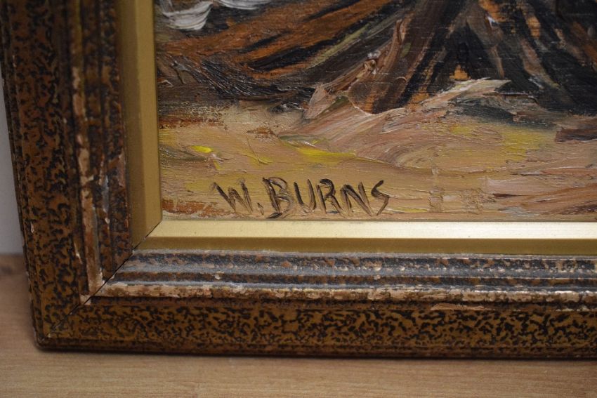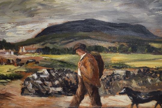 W.Burns (20th Century) Oil on board 'Heading Home, Slemish Mountain' a man and dog walking together beneath the Irish mountain, signed lower left, entitled verso, within thin gilt slip and moulded frame, 45.5cm x 30cm & 54cm x 38.5cm overall. *Possibly the work of William Henry Burns (1924 - 1995) however signature differs slightly to other recorded works.
