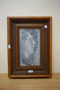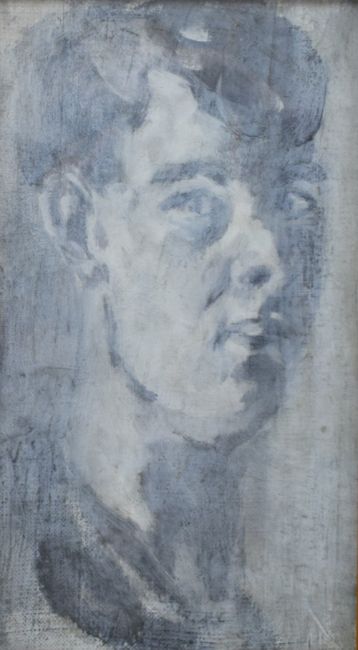 In the manner of Mervyn Peake (British 1911 - 1968) Oil on board, a whitewashed portrait of a young man, within moulded frame, under glass 17cm x 31cm & 37cm x 50.5cm overall.