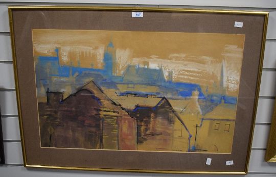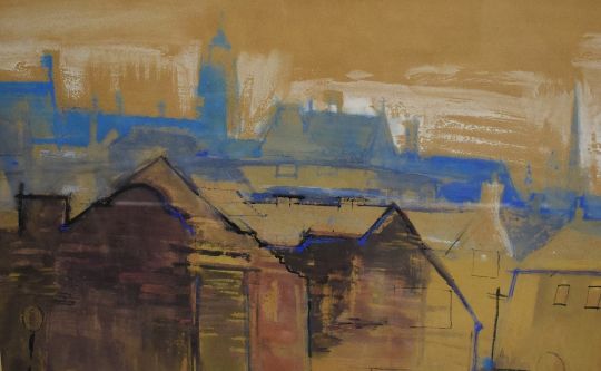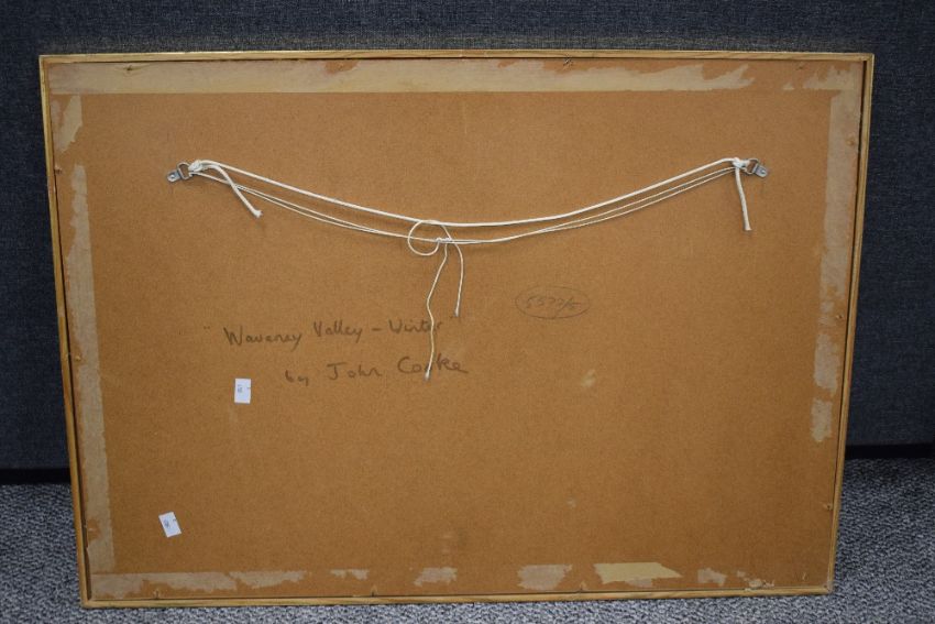 *Local Interest* John Cooke (British 1929 - 2018) watercolour 'Waveney Valley - Winter' a study over the rooftops of Harleston Norfolk, attributed and entitled verso, within card mount and gilt frame, under glass 68.5cm x 43cm & 84cm x 59.5cm overall.