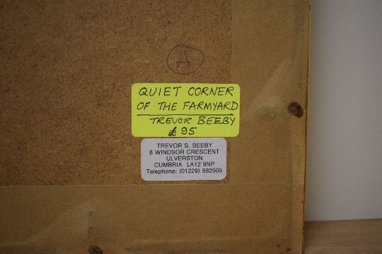 *Local Interest* Trevor Beeby (British 20th Century) Watercolour 'Quiet Corner of The Farmyard', depicting chickens outside a barn, signed and dated? (7.99) lower right, entitled and attributed verso, within stepped card mount and moulded frame under glass 22cm x 31.5cm & 42cm x 50cm overall.