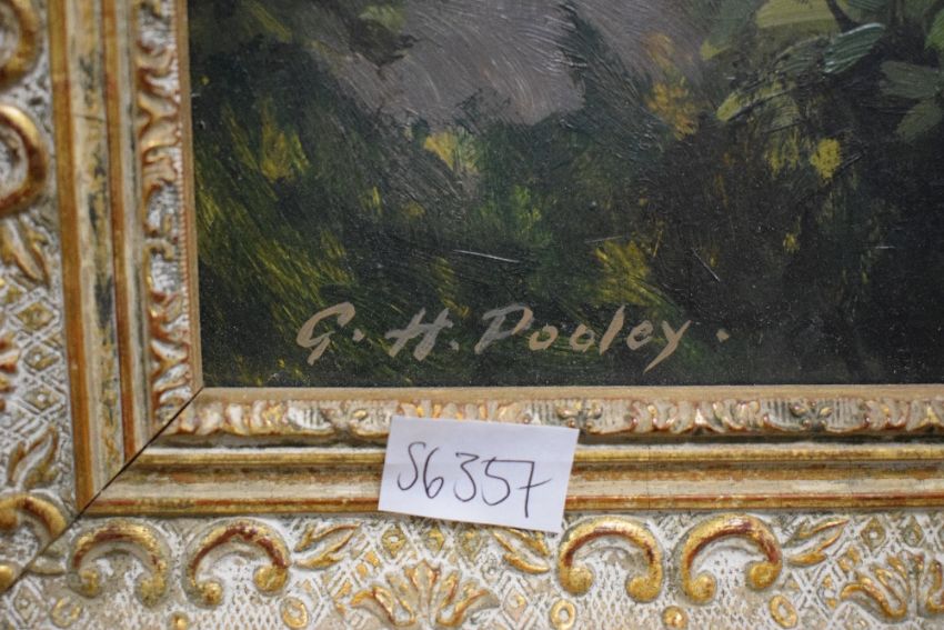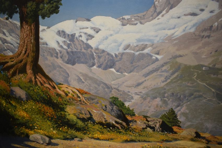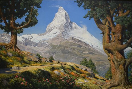 *Local interest* Geoffrey H Pooley (British 1908 - 2006) Oil on canvas, depicting iconic European mountain the Matterhorn as seen from Switzerland in summer, signed lower left, within moulded gilt frame, 60cm x 103cm & 79cm x 113cm overall. *painting was commissioned by the vendor's family and depicts the view from a chalet.