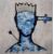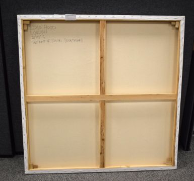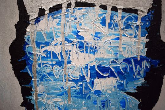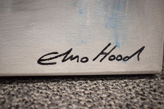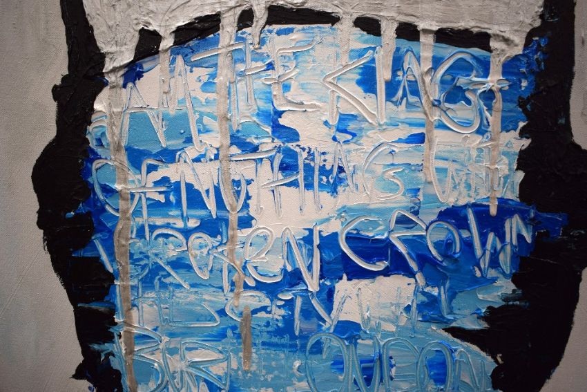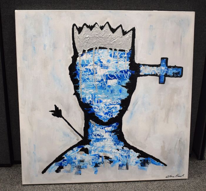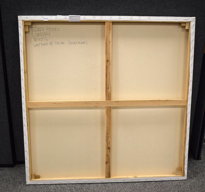 Elmo Hood (British b.1986) Acrylic on canvas 'Last King of London', depicting a faceless King impaled with sword and arrow in cool tones, signed lower right, counter signed entitled and dated (8/10/16) verso, 100cm x 100cm overall.