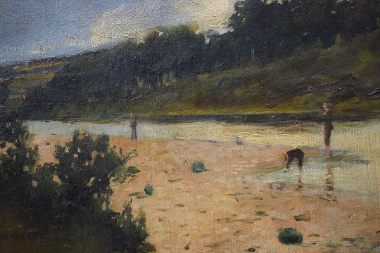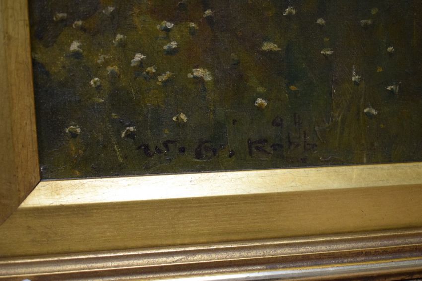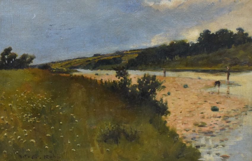 William George Robb (British 1872-1940) Oil on canvas, a Scottish summer river scene with figures, signed and dated (1894) lower left, within gilt slip and moulded gilt frame, 44cm x 29cm & 64cm x 49cm overall.