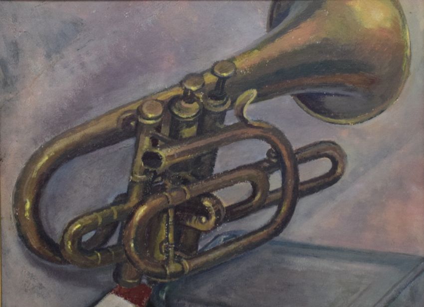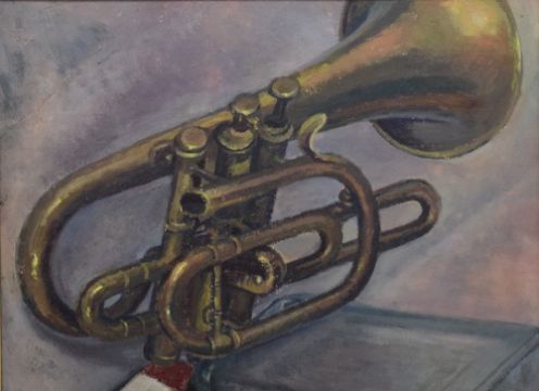 Stanley Herbert Gill (British 1912 - 2000) Oil on board, a still life study of a brass cornet on a pastel coloured background, signed in pencil upper left, attributed verso, within card slip and moulded wooden frame, 35.5cm x 26cm & 57cm x 47.5cm overall.