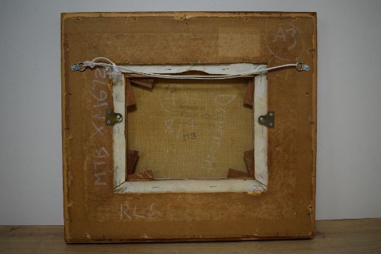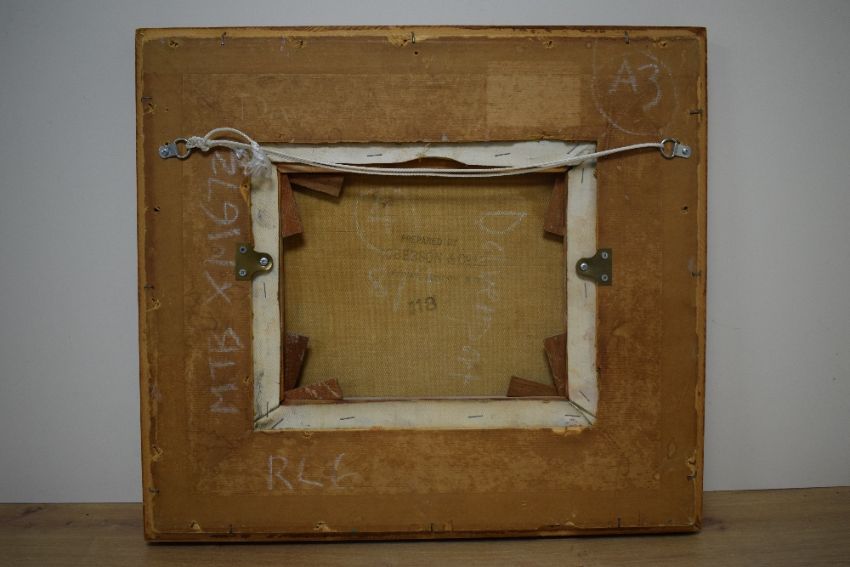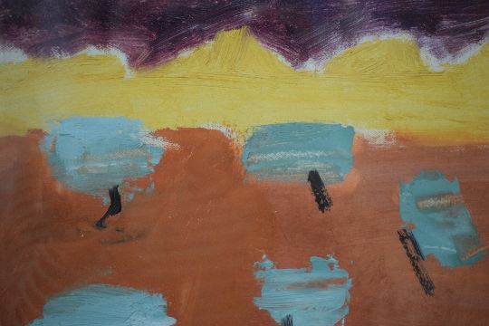 Olga Davenport (South African 1915 - 2008) Oil on canvas, an abstract mountainous landscape study in warm tones, attributed to canvas verso alongside artist biography, within canvas lined wooden tray frame, under glass, 30cm x 25cm & 50cm x 44.5cm overall. *Also known as Olga Edwards, Davenport had a career as an actress in film and theatre before she returned to painting and trained at Chelsea Polytechnic (Now Chelsea College of Arts) part of the Royal College of Arts and also at Peter Lanyon's school in St Ives, Cornwall.