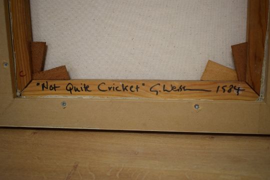 Gabriel Weissmann (British 1944 -1997) Oil on canvas 'Not Quite Cricket', an abstract composition using geometric shapes and bold colour, signed and dated (1983/84) lower right, entitled counter signed and dated (1984) verso alongside artist biography, within off white tray frame, 38cm x 32.5cm & 42cm x 37cm overall.