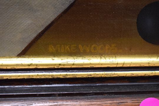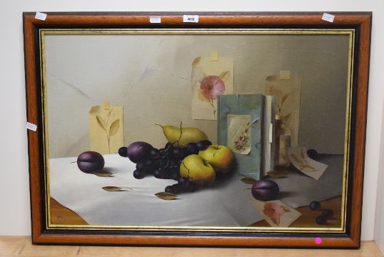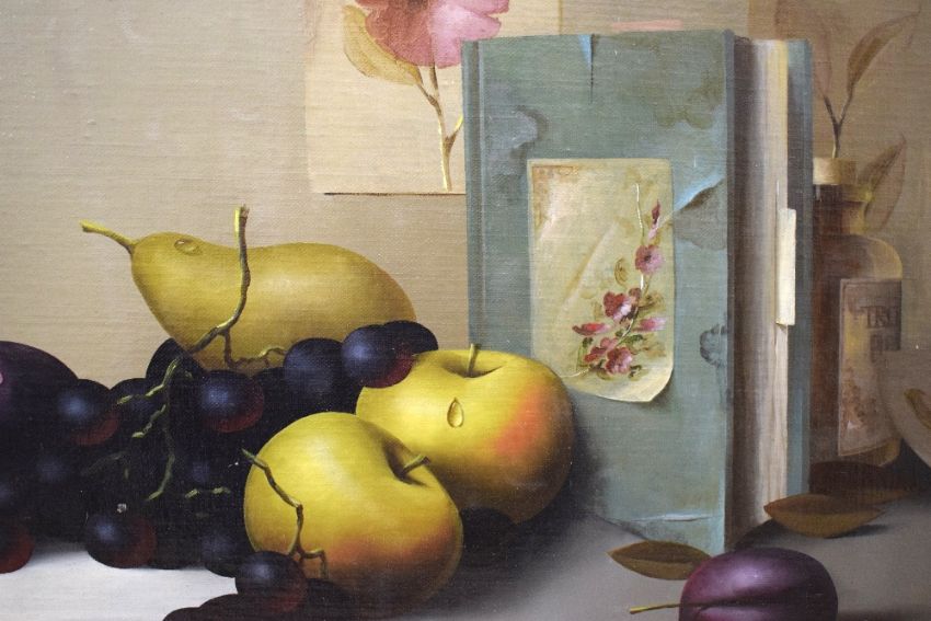 Mike Woods (British b.1967) Oil on board, a still life study depicting a sketchbook amongst fruit, signed lower right, within moulded wooden frame, 73cm x 48cm & 83.5cm x 58.5cm overall.