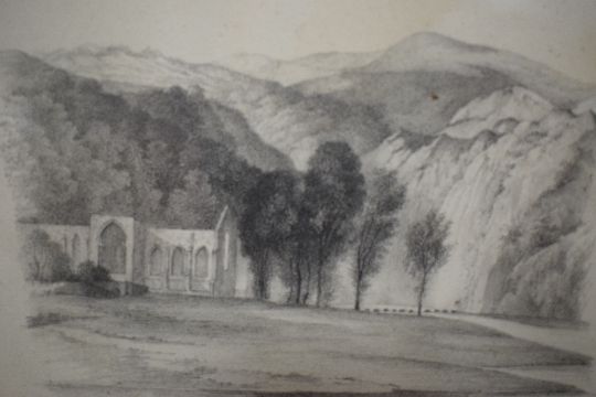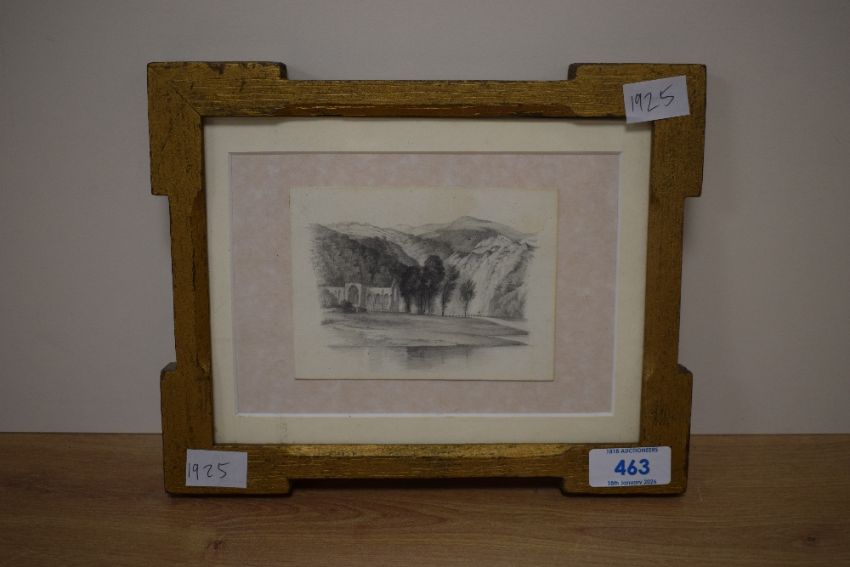 A 19th century graphite sketch depicting a countryside landscape with ruins, unsigned or attributed, within card mount and moulded frame, under glass 11cm x 8cm & 23cm x 18cm overall.