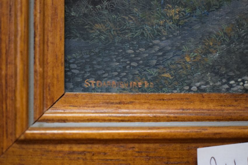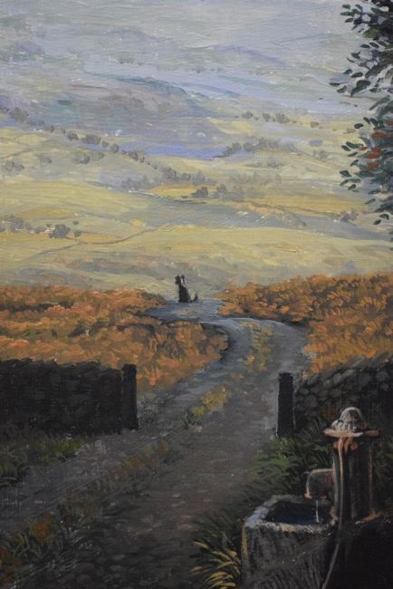 *Local Interest* Stephen Darbishire (British b.1940) Oil on board 'Johnny's Late' depicting a border collie awaiting it's owner's return just outside of a farm yard's boundary, signed lower left, attributed and entitled verso, within moulded frame, 11.5cm x 16.5cm & 20.5cm x 25.5cm overall.