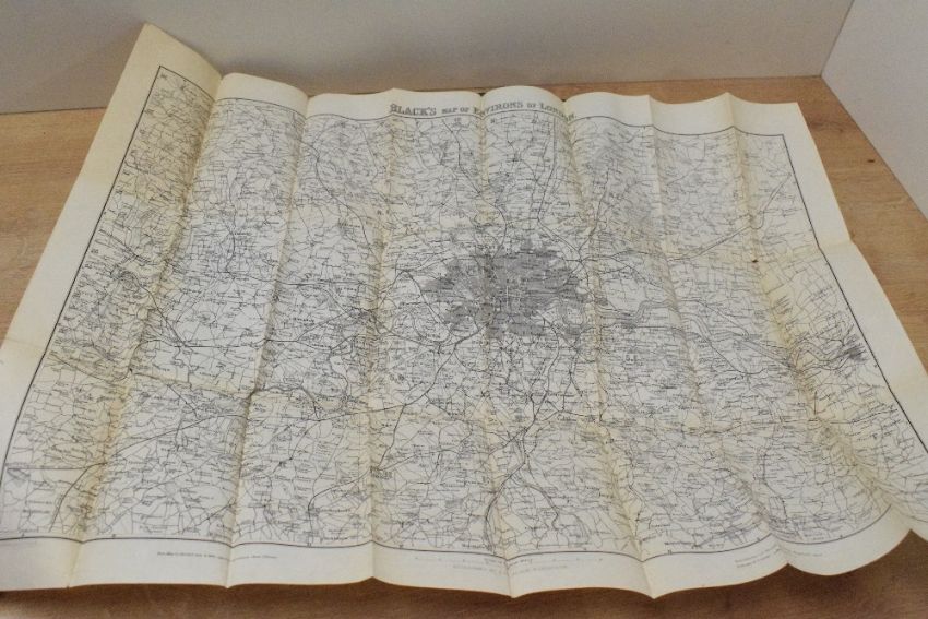 Topography. London interest. Two titles. Cruchley's Picture of London, &c. London: 1834. Second edition. Frontispiece folding map removed. With; London and its Environs A Practical Guide to the Metropolis and its Vicinity. Edinburgh: Adam & Charles Black, 1862. Folding map in rear pocket, front pocket empty. Both in original cloth. (2)