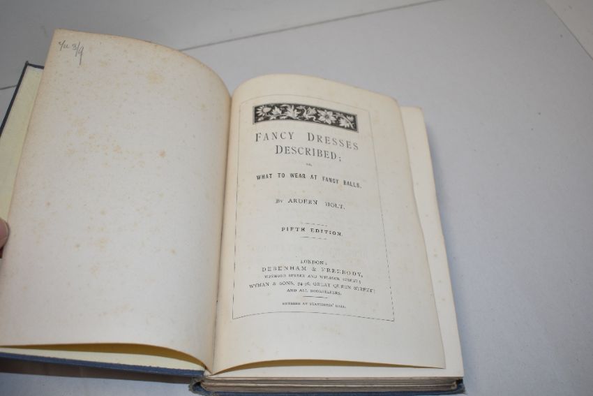 Fashion & Clothing. Holt, Ardern - Fancy Dresses Described; or, What to Wear at Fancy Balls. London: Debenham & Freebody. 1887. 5th edition. With 16 colour plates. Original cloth. Shaken. (1)