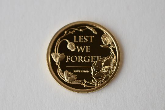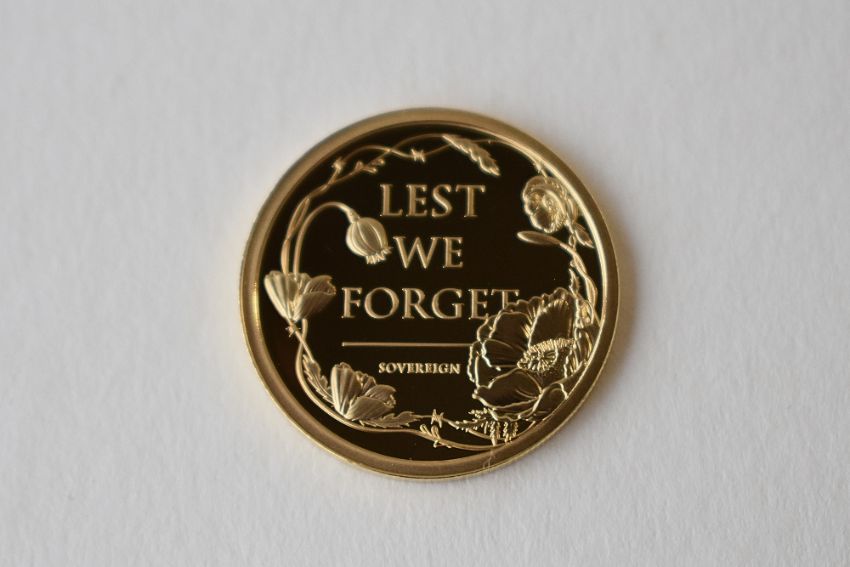 A Queen Elizabeth II 2022 Gold Proof Sovereign, Remembrance Day, Issued Alderney, Obv Portrait Elizabeth II, Rev Lest We Forget Remembrance Design, Weight 8.00 Grams, Harrington And Byrne Certificate Of Authenticity, Encapsulated, Presentation Box With Outer Cardboard Sleeve.
