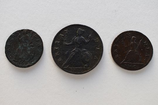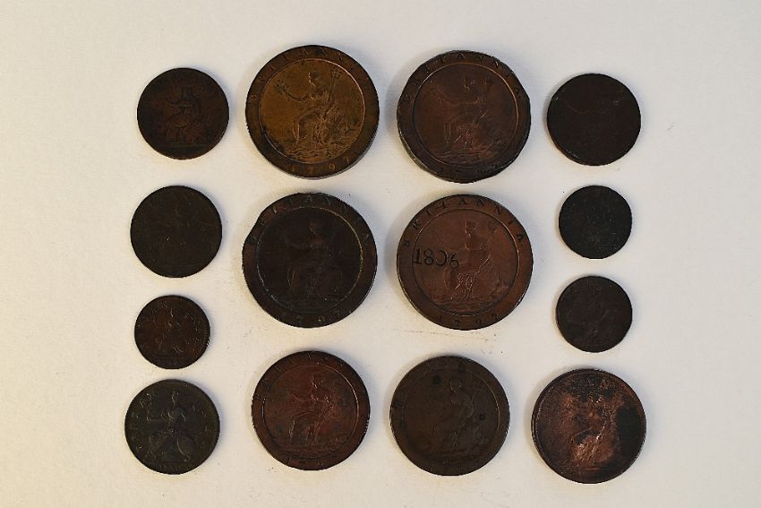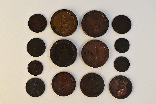 A Collection Of William And Mary, George II And George III Copper Coinage, Comprising, A William and Mary 1694 Farthing, Conjoined Bust, Rev Britannia, A George II 1730 Halfpenny, Young Head Laurel And Cuirass, A George II 1746 Farthing Old Head Laurel And Cuirass, George III 1797 Cartwheel Twopences x4, George III Cartwheel Pennies x2, A George III 1806 Soho Penny, Rev Britannia Seated And Soho Mint Halfpennies 1806 x2 And 1807, A George III Farthing 1799 Third Issue. (14)
