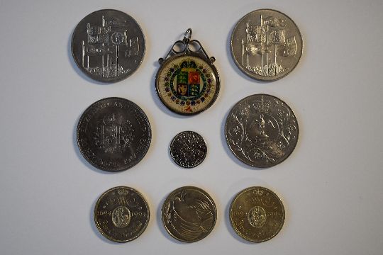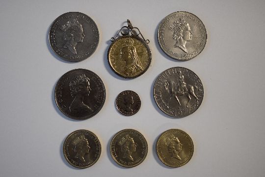 A Collection Of Nineteenth and Twentieth Century Coins Comprising A Queen Victoria 1887 Coloured Enamelled Silver Halfcrown In A Scrolled Mount. Elizabeth II Commemorative £5 Crowns 70th Birthday x2 And Twenty five Pence Commemorative Crowns, Comprising, 1972 Elizabeth And Philip Silver Wedding, 1977 Silver Jubilee. £2 Coins Comprising, Bank Of England 1694-1994, x2, 1995 50th Anniversary of End of WWII, An Elizabeth II 1965 Sixpence. Approx Silver Content 13 Grams