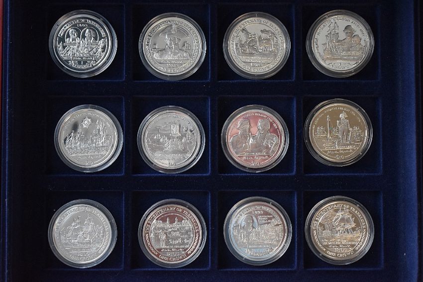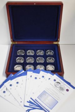 The Vice Admiral Lord Nelson Sterling Silver Proof Crown Coin Collection, Issued The Isle Of Man, The British Virgin Islands And The Falkland Islands. Each Coin Portraying A Different Aspect Of Nelson's Career. Each Coin Encapsulated, Eleven With Royal Mint Certificates. Individual Coin Weight 28.28 Grams. Wooden Presentation Box. (12) Total Weight Sterling Silver approx 339 Grams
