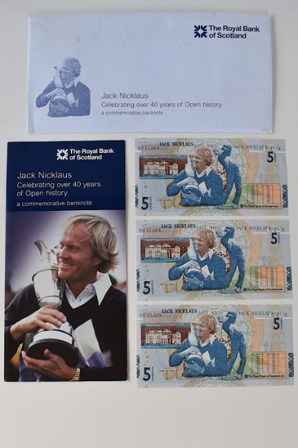 Royal Bank Of Scotland Jack Nicklaus Commemorative £5 Banknotes, Uncirculated Consecutive Numbers, JWN 0302269, JWN 0302270, JWN 0302271. (3)