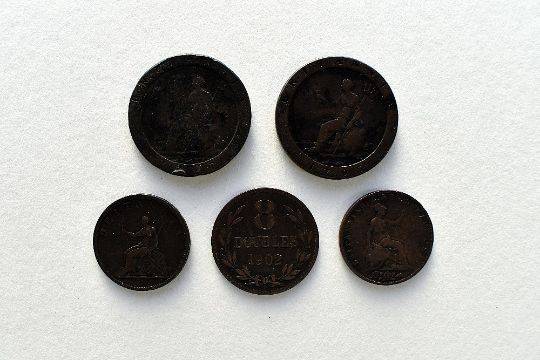 George III 1797 Cartwheel Pennies x2, A George III 1806 Soho Mint Halfpenny, A Queen Victoria 1854 Halfpenny, A Guernsey 1902, 8 Doubles. (5)