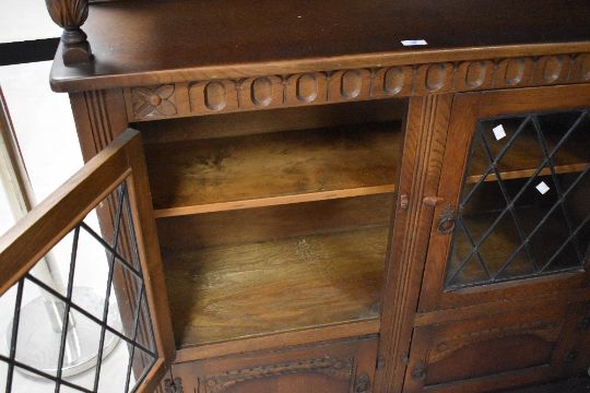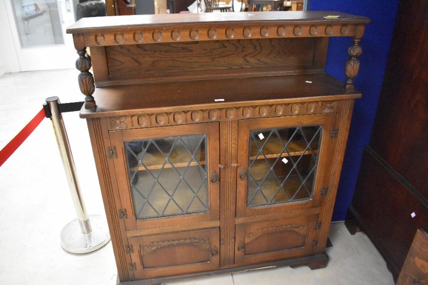 A Stanley Wood of Olney reproduction oak court cupboard style bookcase/display cabinet, having two glazed cupboard doors over two smaller panelled doors, 129cm x 110cm x 31cm
