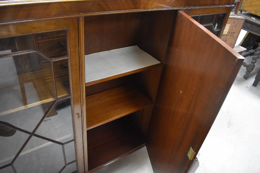 An early 20th century mahogany side-by-side bookcase, the two astragal glazed end sections enclosing the central cupboard, raised on short cabriole type supprts116cm x 133cm x 27cm