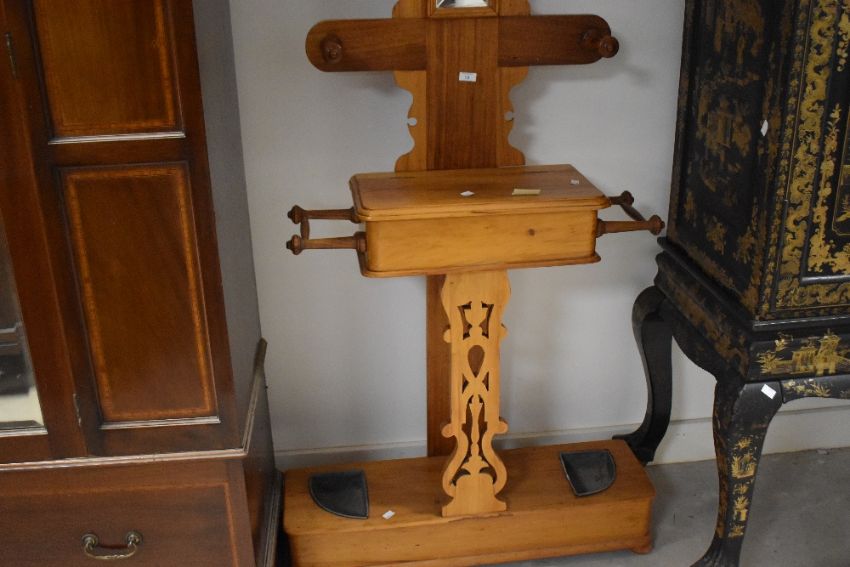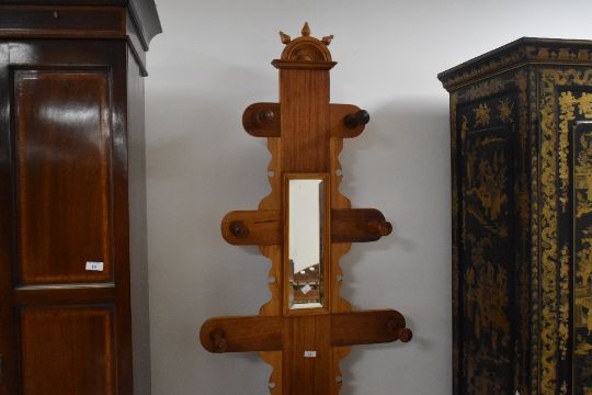 A Victorian walnut and mahogany hall stand, the central mirrored upright issuing graduating coat hook branches over a hinged rectangular box section and end stick/umbrella divisions with galvanised drip pans 207cm x 74cm x 27cm